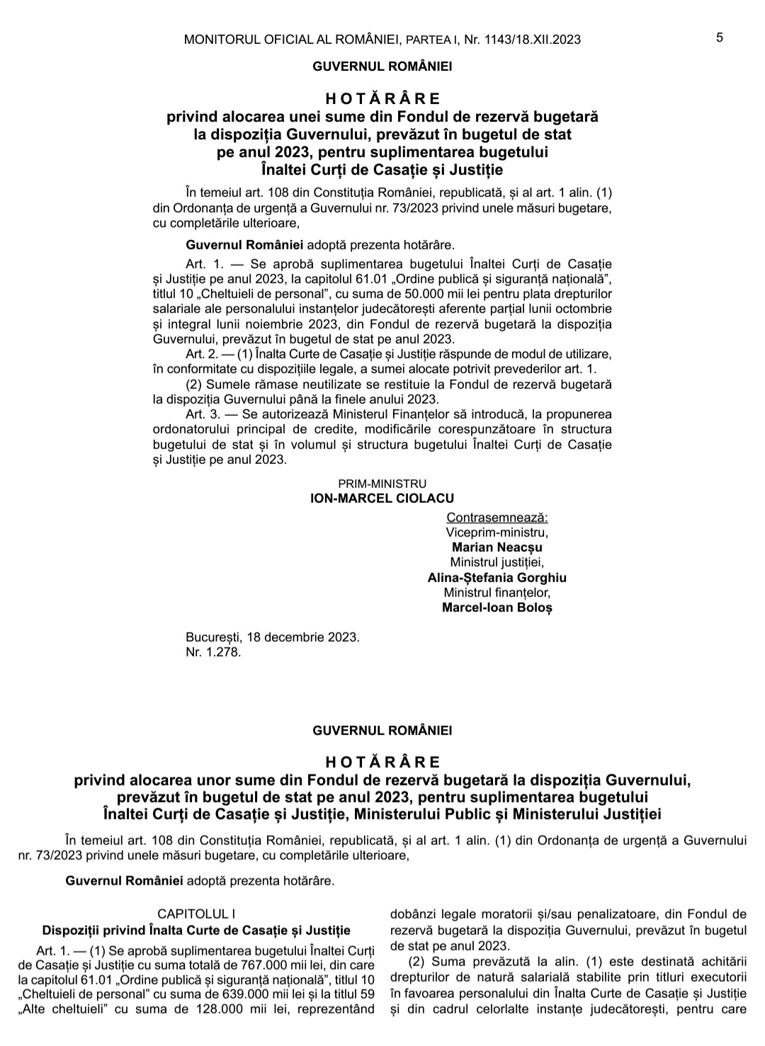 În MONITORUL OFICIAL AL ROMÂNIEI, PARTEA I, Nr. 1143/18.XII.2023, a fost publicată HOTĂRÂRE 1279/2023 privind alocarea unei sume din Fondul de rezervă bugetară la dispoziția Guvernului, prevăzut în bugetul de stat pe anul 2023, pentru suplimentarea bugetului Înaltei Curți de Casație și Justiție