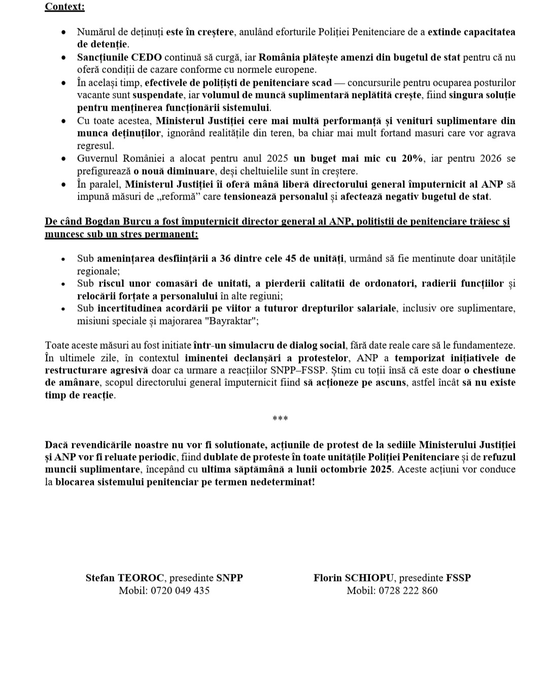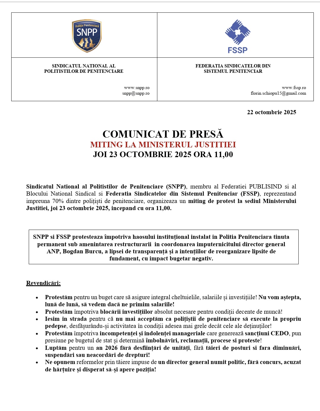 Sindicatul National al Politistilor de Penitenciare (SNPP), membru al Federatiei PUBLISIND si al Blocului National Sindical si Federatia Sindicatelor din Sistemul Penitenciar (FSSP), reprezentand impreuna 70% dintre polițiști de penitenciare, organizeaza un miting de protest la sediul Ministerului Justitiei, joi 23 octombrie 2025, incepand cu ora 11,00.