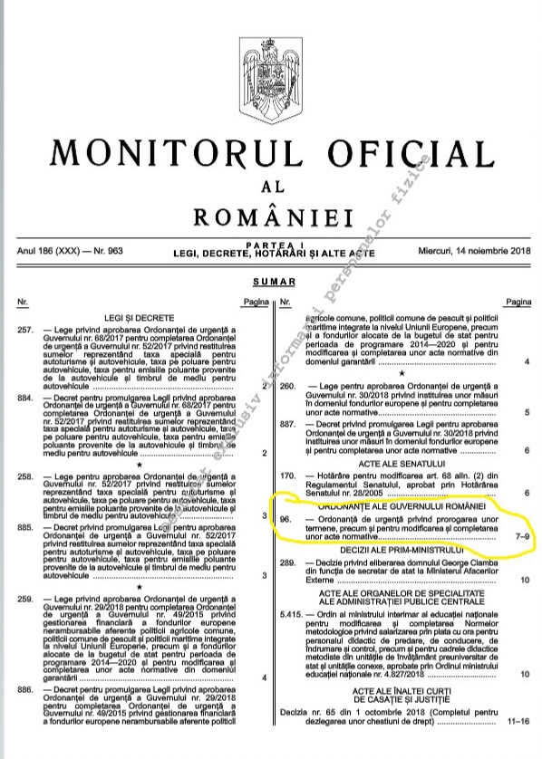 În Monitorul Oficial nr. 963 din 14 noiembrie 2018 s-a publicat O.U.G. nr. 96/2018 privind prorogarea unor termene, precum și pentru modificarea și completarea unor acte normative.