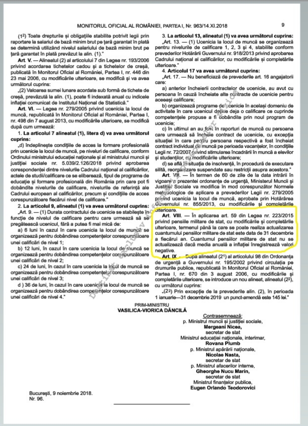 Porivit art. VIII, în aplicarea art. 59 din Legea nr. 223/2015 privind pensiile militare de stat, termenul până la care se poate realiza actualizarea cuantumului pensiilor militare de stat este data de 31 decembrie a fiecărui an, iar cuantumul pensiilor militare de stat nu se actualizează dacă media anuală a inflației înregistrează valori negative