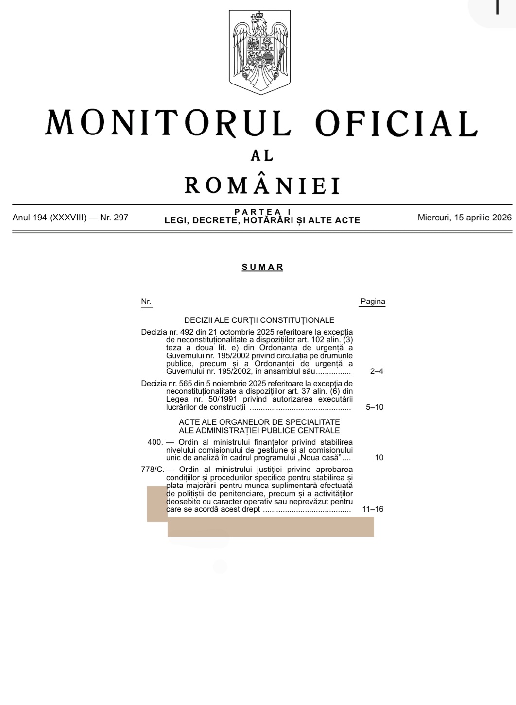 În Monitorul Oficial al României, Partea I, nr. 297 din 15.04.2026, a fost publicat Ordinul ministrului justiției nr. 778/C privind aprobarea condițiilor și procedurilor specifice pentru stabilirea și plata majorării pentru munca suplimentară efectuată de polițiștii de penitenciare.