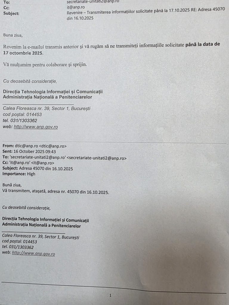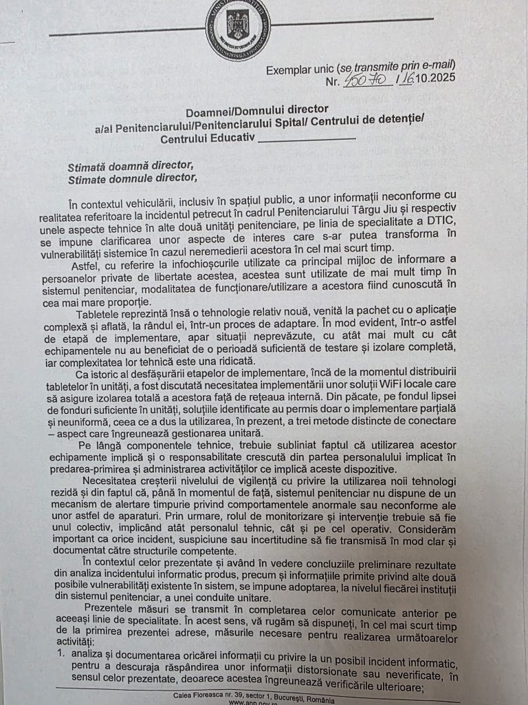 Noi spuneam ca Administrația Națională a Penitenciarelor, prin directorul general Burcu, minte când spune ca a dispus toate măsurile pentru a se face verificări in sistemul penitenciar cu privire la acest lucru, iar acesta împreună cu protectorul sau, ministrul Marinescu spuneau presei ca noi dezinformam. Abia prin adresa trimisa azi in unități se cere sa se facă o verificare a celor transmise de noi in tot sistemul penitenciar.Azi avem si dovada minciunii directoriale din ANP si o prezentăm mai jos: