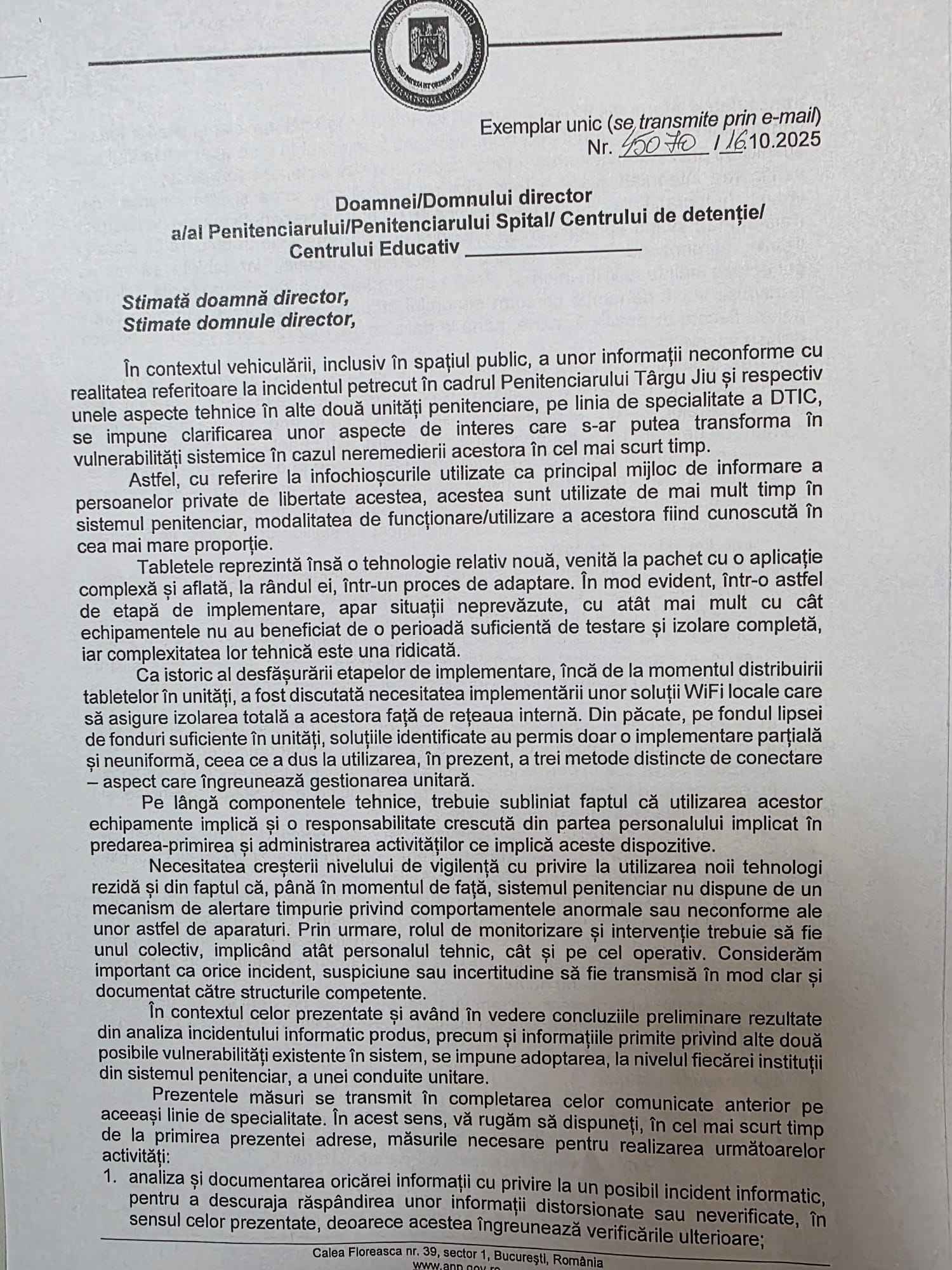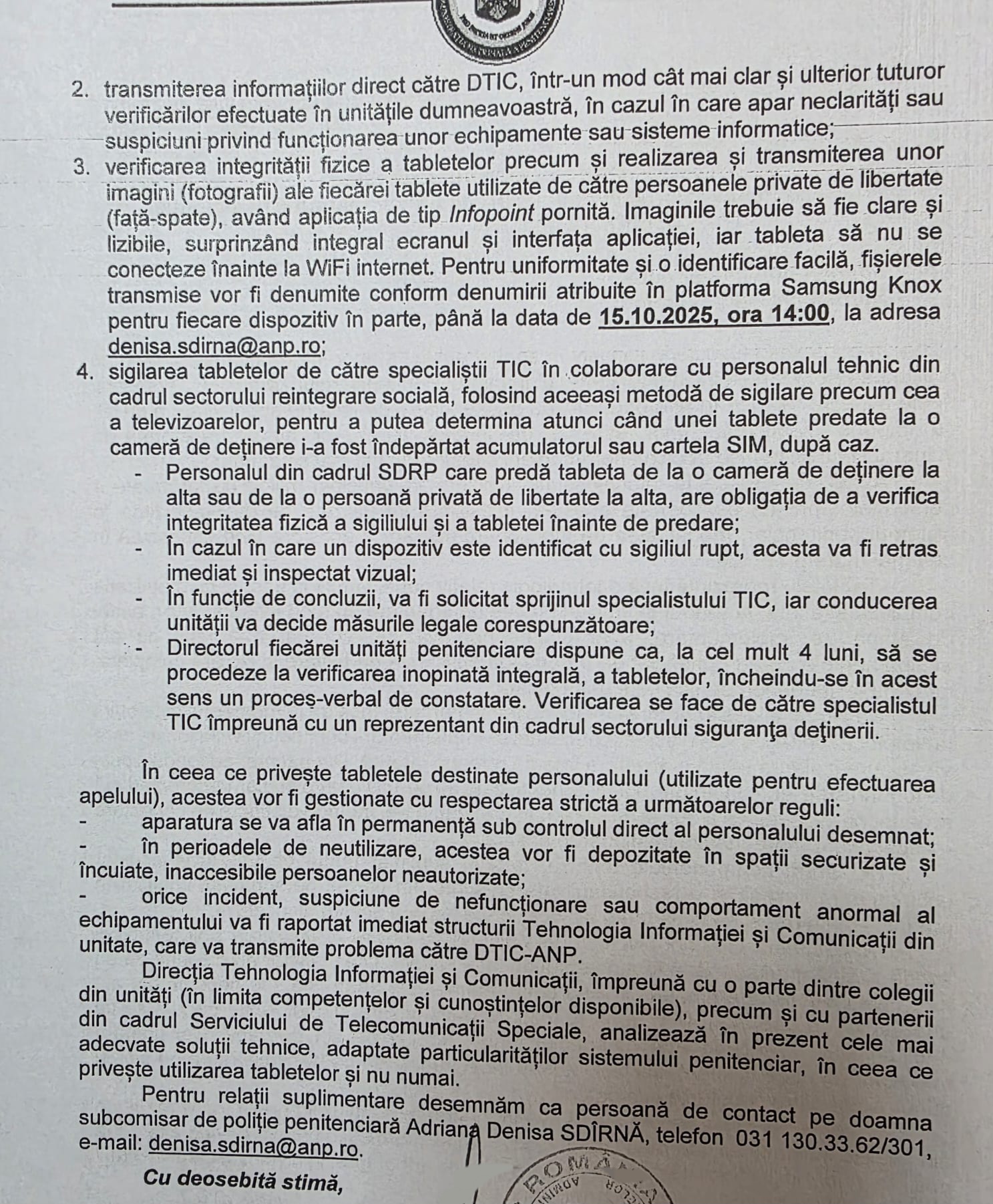 Si ca sa o faceți si temeinic sa o faceți până mâine. Acum nu știm până la ce oră. Mă gândesc că dacă ANP-ului i-au trebuit o lună jumătate să-și revină după șocul breșei de la Tg-Jiu celor din unități le este de ajuns o jumătate de zi sa facă același lucru? Mai ales ca in adresa de azi, la punctul 3, se cere ca pana ieri la ora 15 sa fie transmise date despre tablete. Adevarată comunicare a directorului Direcției IT din ANP recompensată cu majorare de 50% de directorul general Burcu . Si eu care ca un necunoscător ii ceream sa nu-i dea. Bravo nea Geo!!! Bravo nea Marinescule!!!